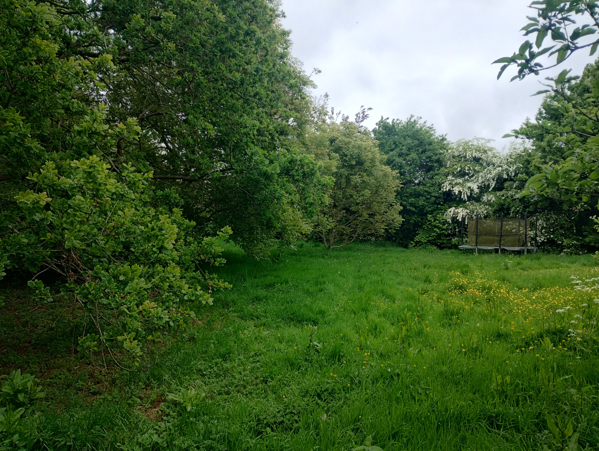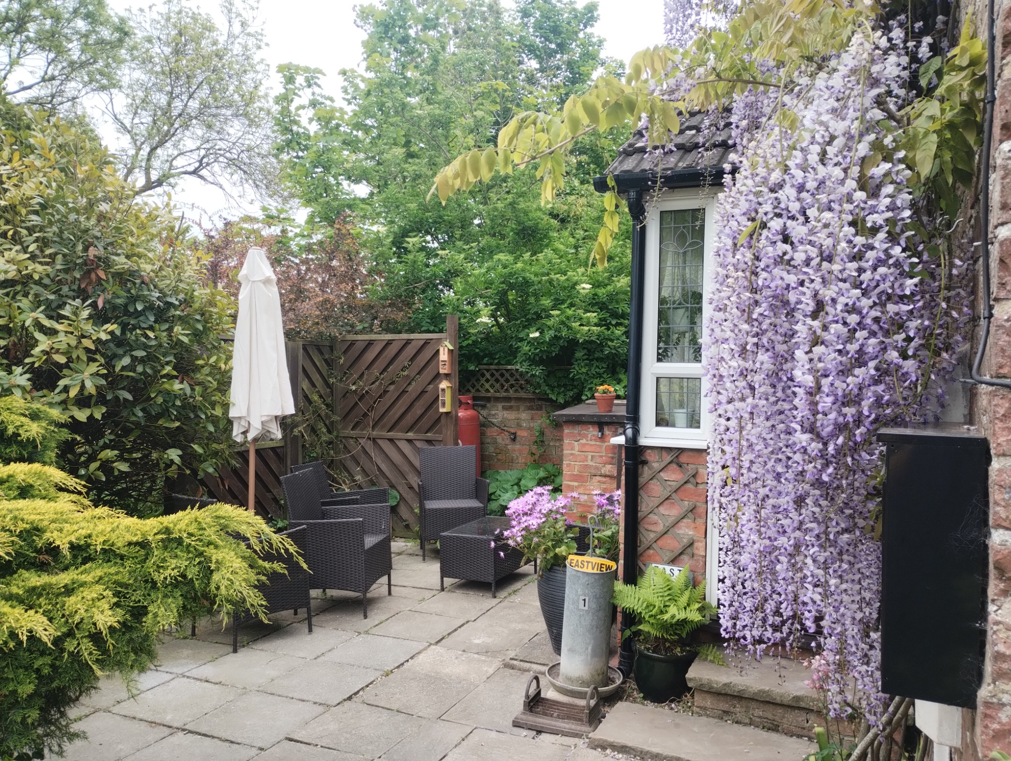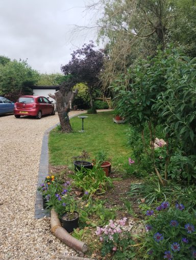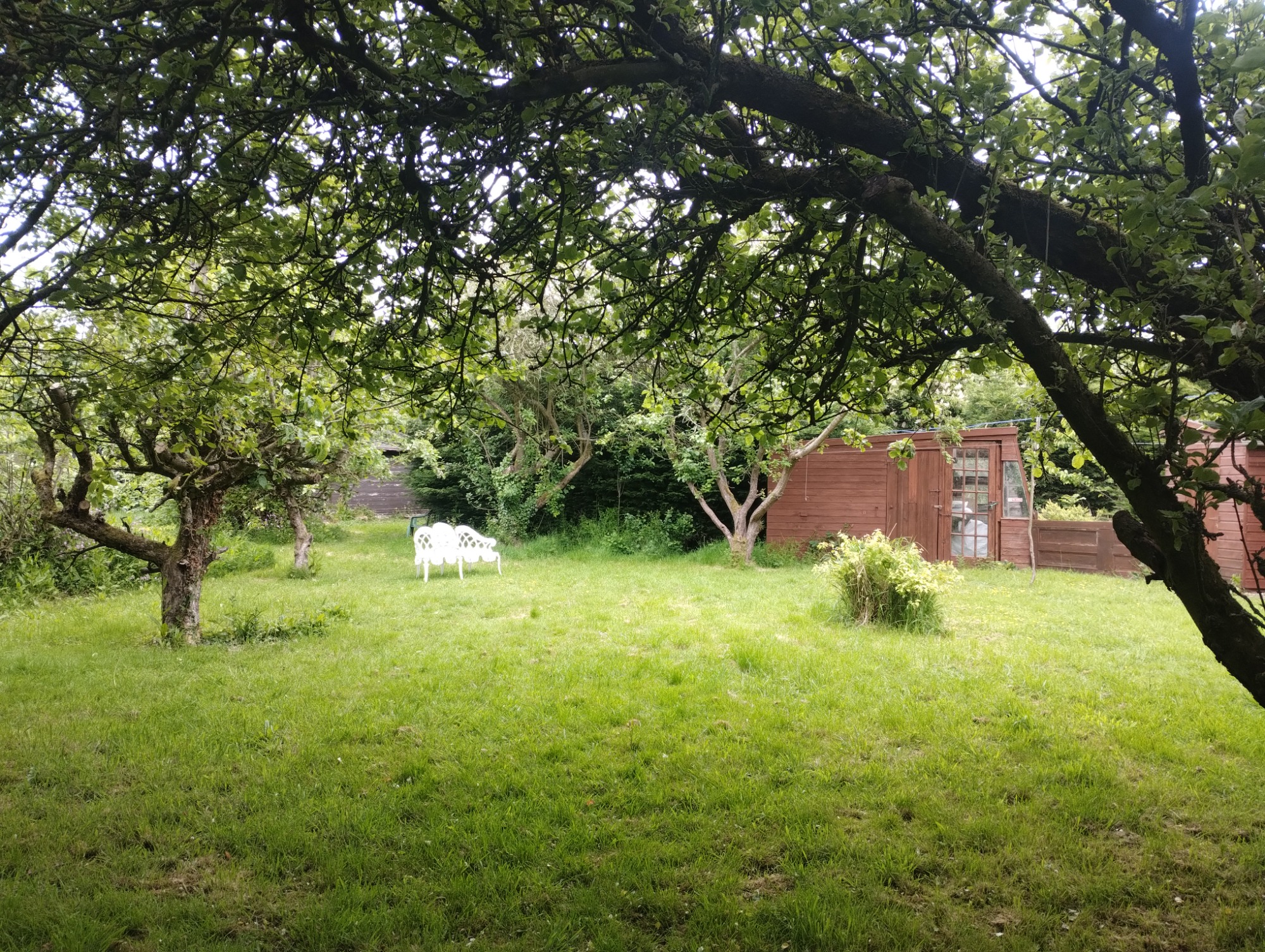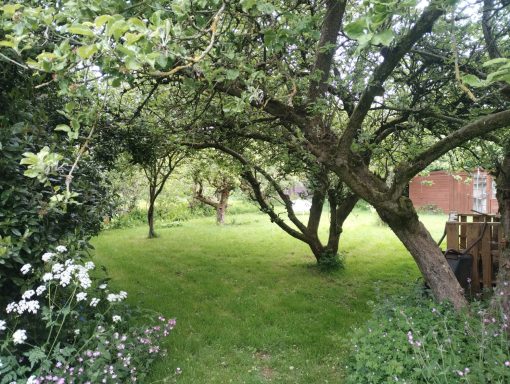 Outside the cottage, including garden with mini orchard, patio area and driveway.
