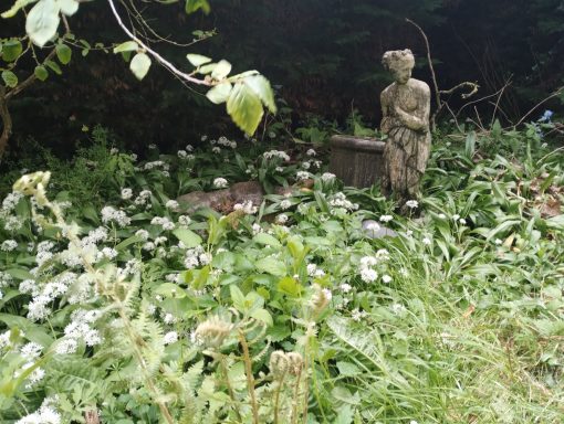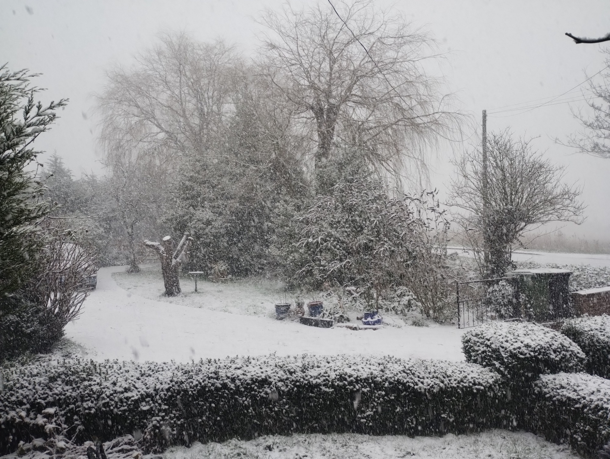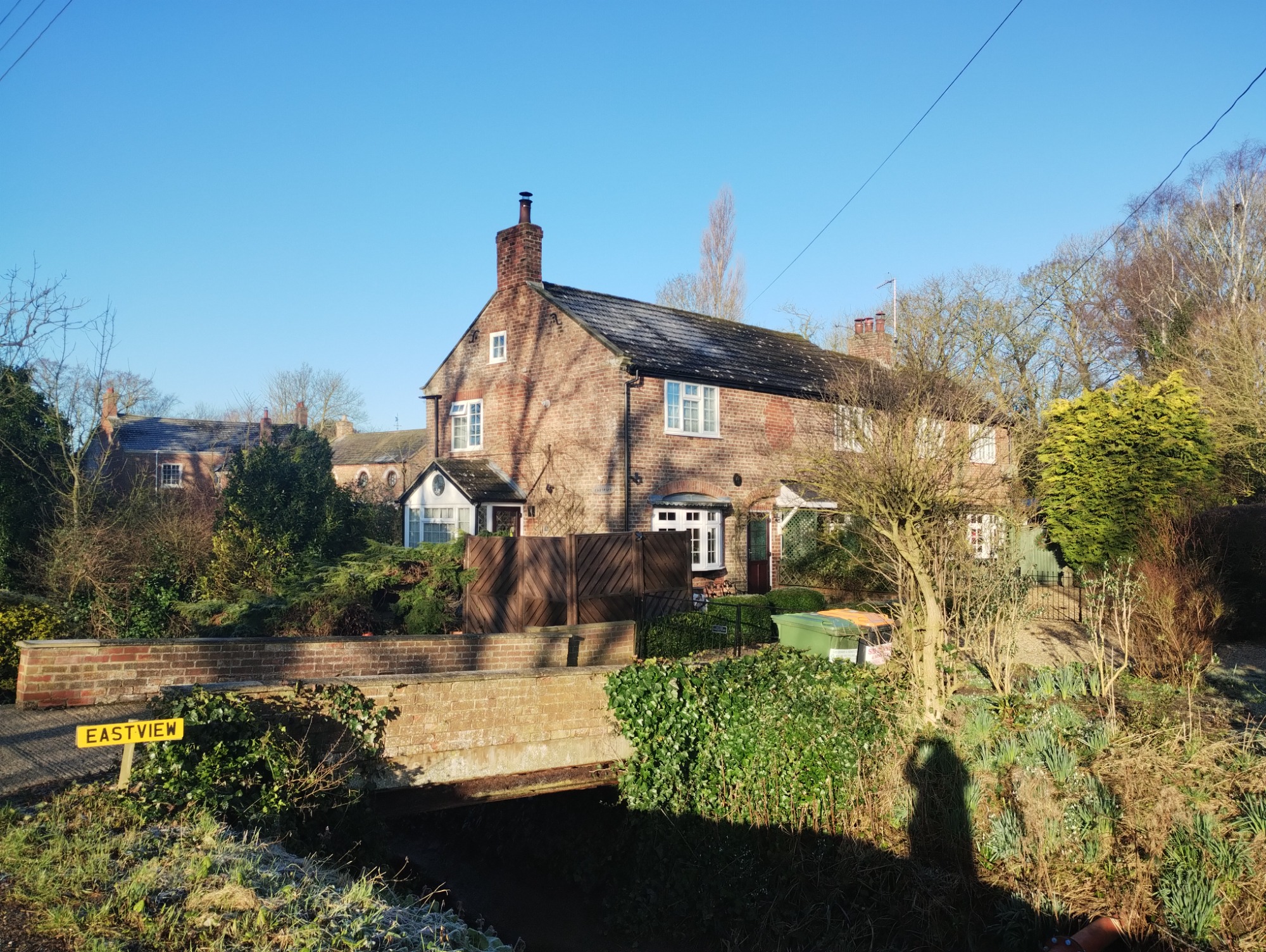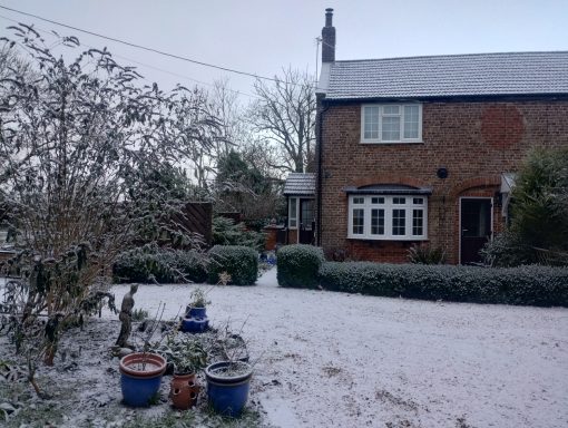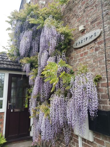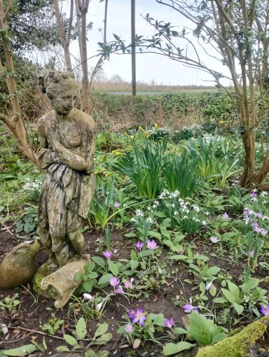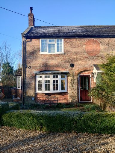 Outside the cottage, including garden with mini orchard, patio area and driveway.